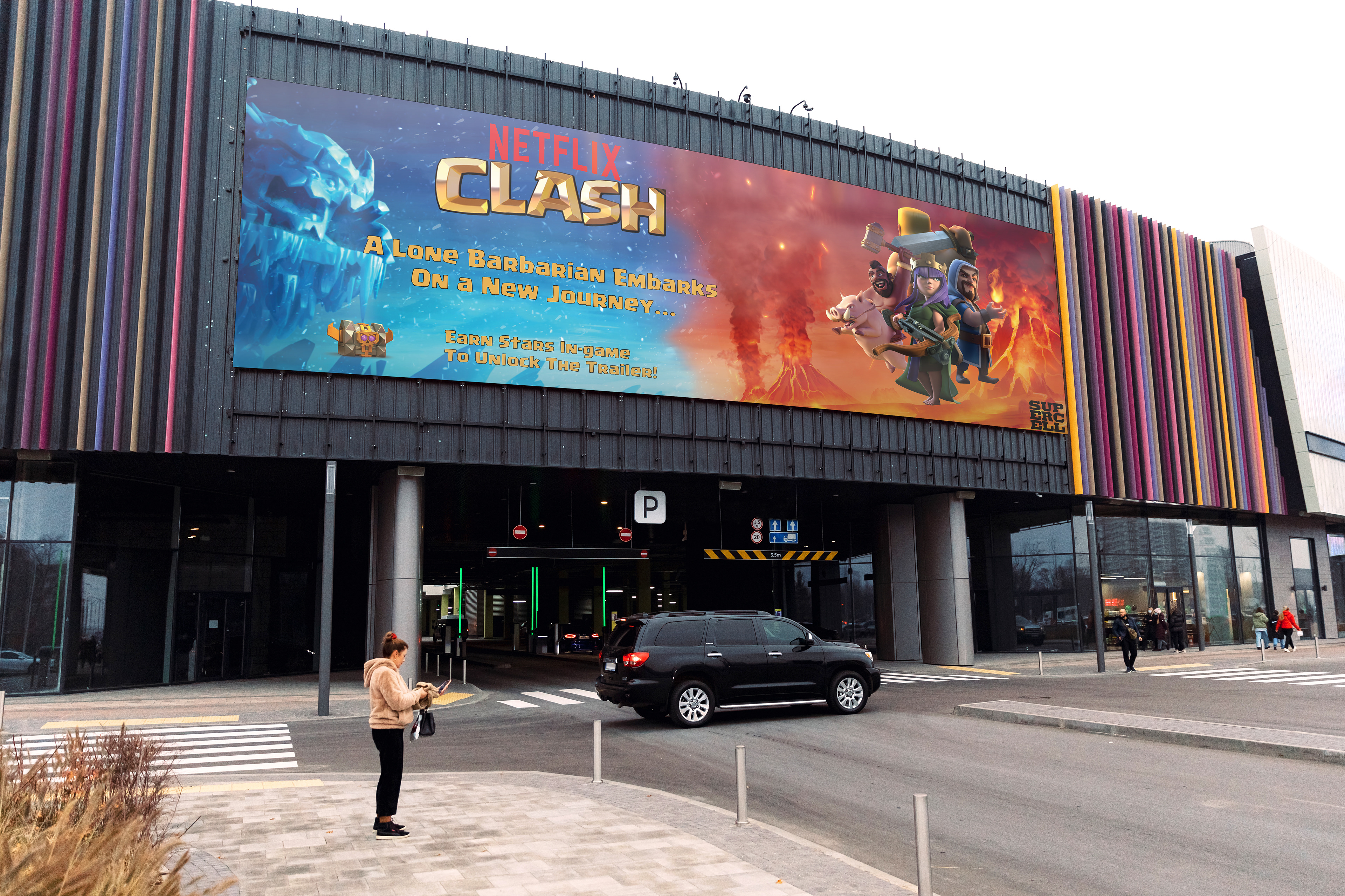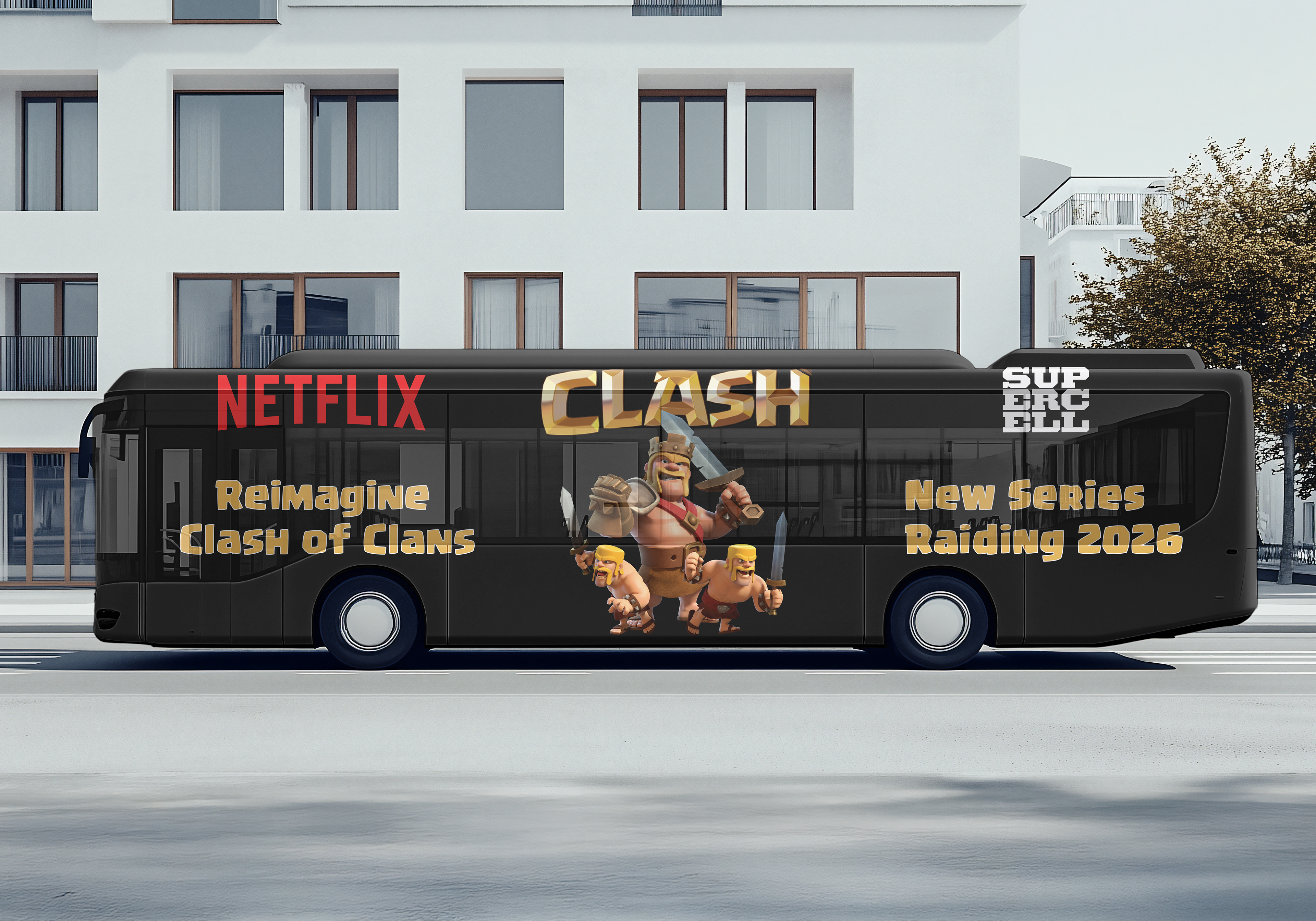 While the layouts and copy for all the executions below were of my own doing, the location and basic concepts were created by the group, then left to me to expand upon. I took majority inspiration from Netflix's prior campaigns on billboards and buses, most notably from Arcane and House of Cards respectively along with the in-game news feed mock-up. Most assets on the executions come directly from Supercell's website that houses renders from Clash of Clans.